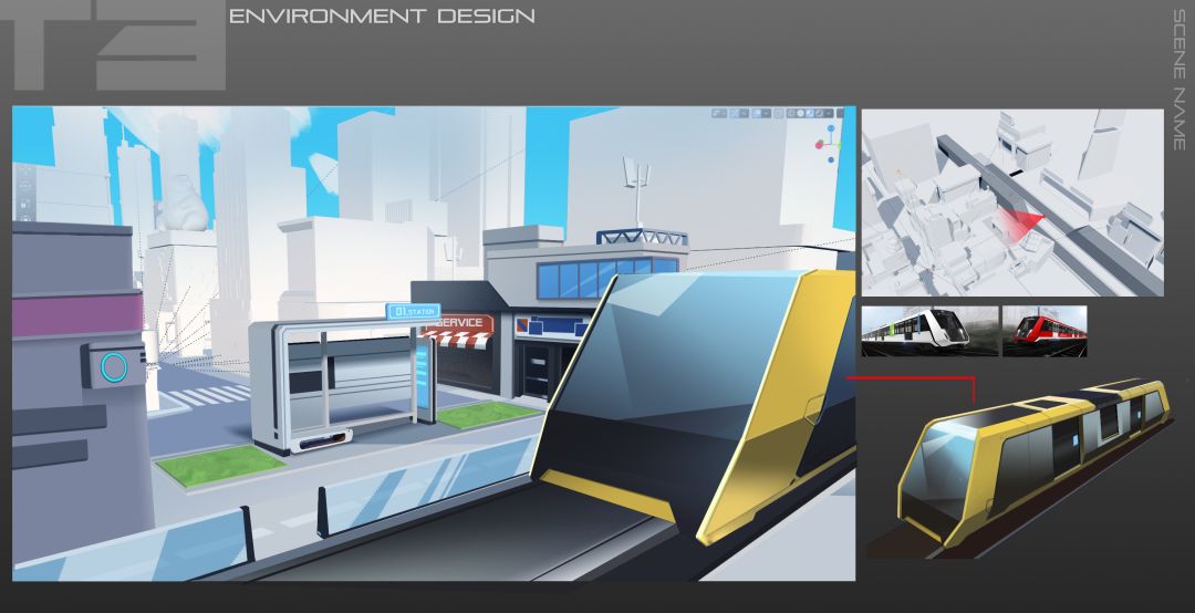 为了呈现出未来都市的真实感,我们丰富了场景的各个区域,包括远处的足球场、地铁口等等,对于这些我们在现实世界中认知较高的区域进行了进一步的科技化体现。