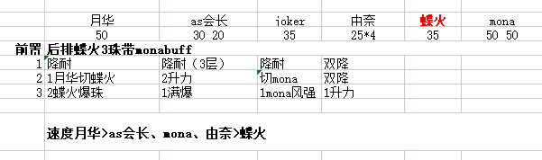 Ps:会长先切蝴蝶叠2次风耐再按下表顺序 蝶火+10火神枪叠3珠带mona换人buff 丢后排