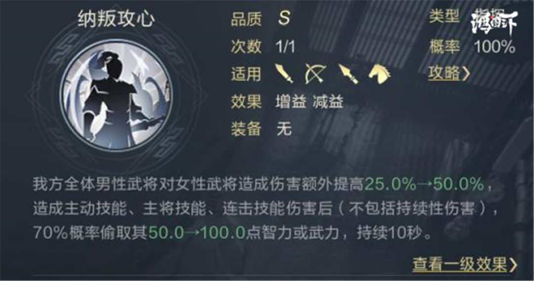 备选技能:纳叛攻心(针对女将)磐石、却敌、治疗类等。
