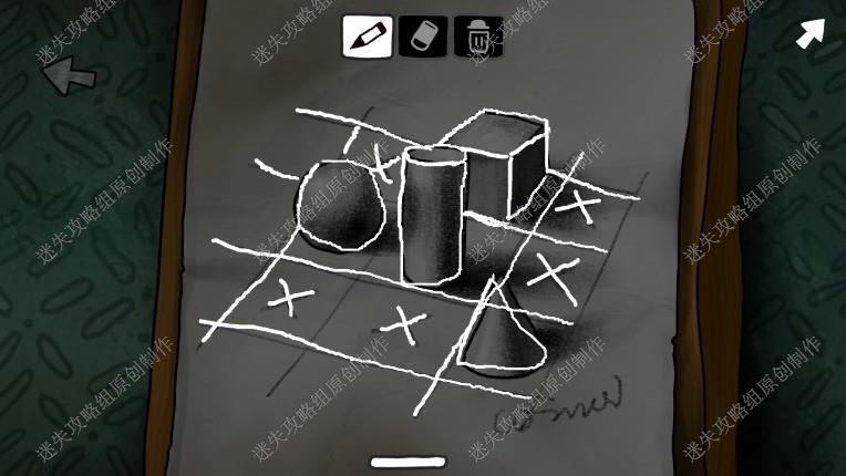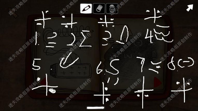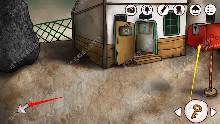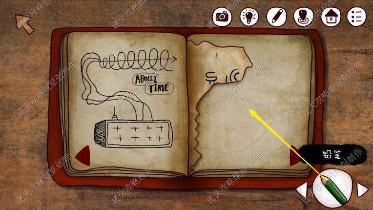 4. 来到二楼,记下黑板上的图案,看桌上的日记,拿到信箱钥匙(在最后一页),获得一些有用的信息:1.老爷爷的时光机器可使用2.山顶其实有个太空旅行的火箭3.密码在这本笔记本上不过被撕掉了,下楼出门。