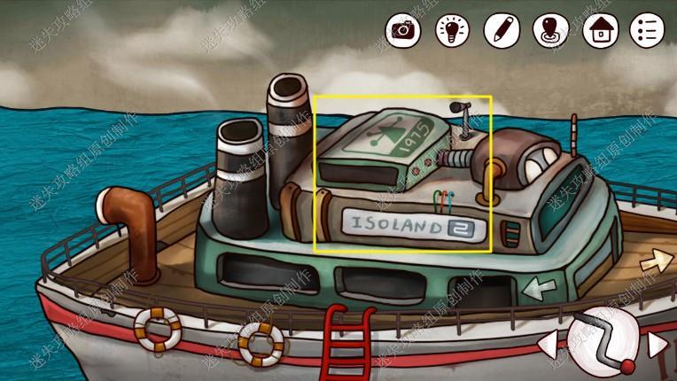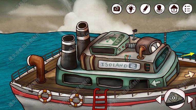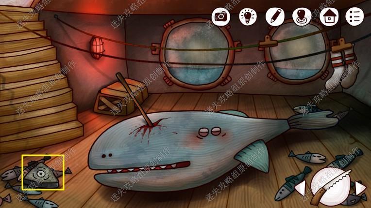 19. 来到码头,捡起漂流瓶,将瓶中图案截图记录,接着我们去到船上底部鲸鱼处,用工厂里拿到的刀,把鲸鱼的肚子刨开,拿到鱼骨和矛头,然后前往码头售票处二楼,把灯泡给到小男孩,拿到白色贝壳。