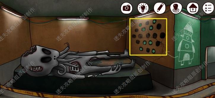 17. 我们需要打开左边这道门,需要完成开门游戏(需要把所有方块占满,非常简单,因为不用转弯所以看着格子就知道是哪里了),进入后我们发现了一具外星人尸体,把墙上的线索记录下来,我们前往灯塔2楼。