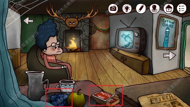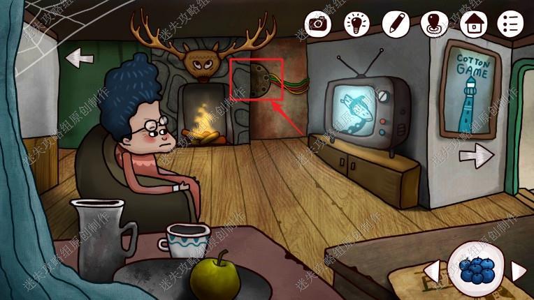2. 我们来到了客厅,一个老奶奶在看电视,把桌上的蓝莓和火柴拿走,然后点击老奶奶了解信息1.帮她信箱的钥匙2.老爷爷一辈子都在楼上捣鼓时间机器3.山顶有座工厂4.来爷爷把时间机器的密码写在一本本子上5.需要找到老爷爷的铅笔。