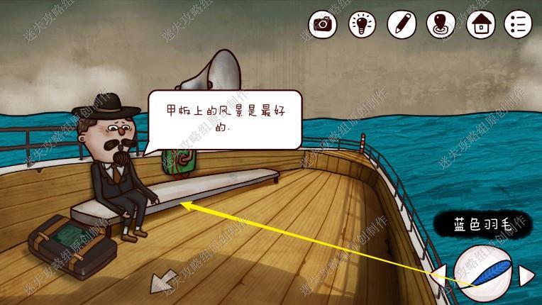 11. 到达楼下,看到了一条鲸鱼,左边地上捡起时间石块,回到船外侧向右去到甲板,和甲板上的人对话获得信息1.他想要蓝色羽毛2.用喇叭可以吸引飞鱼,点击甲板上的喇叭完成游戏(顺序点击,每个人点击的顺序是不一样的),拿到飞鱼