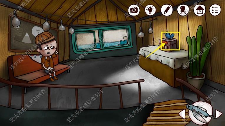 12. 回到码头售票处,右边墙上时钟,把时间调到3:42打开通往二楼的门,来到二楼后和小男孩对话,获得信息:1.桌上有八音盒2.彩灯少了个灯泡亮不起来,点击八音盒,拿到铅笔盒蓝色石块,把摇杆放入八音盒,记录下它发音的顺序:1D2G3E4G5D6A,出码头前往工厂。