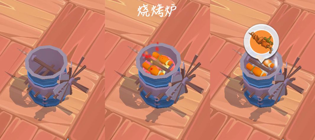 烧烤炉:当当!筏筏要介绍的第一个加工厂就是很多玩家都猜错了的风力发电烧烤炉!消耗各类蔬菜、海鲜等食材制作烤串,如烤萝卜、烤蘑菇等。就算在大海上漂流也是可以吃到烧烤的!