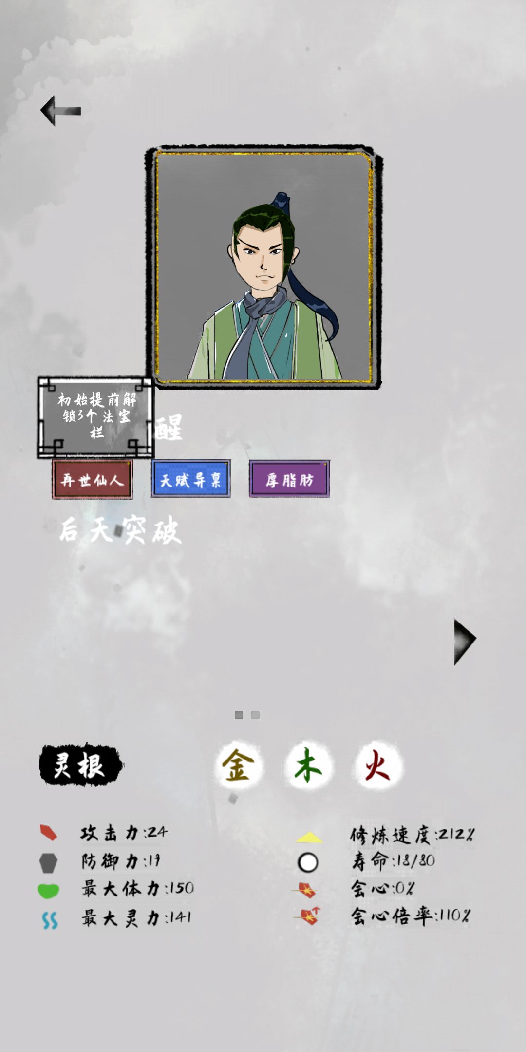 开局必须金木火属性,木头人,丹体,丹炉作为主要属性都可以,我刚好刷了仙人属性,解锁3个装备格,可以防止前期装备被偷。