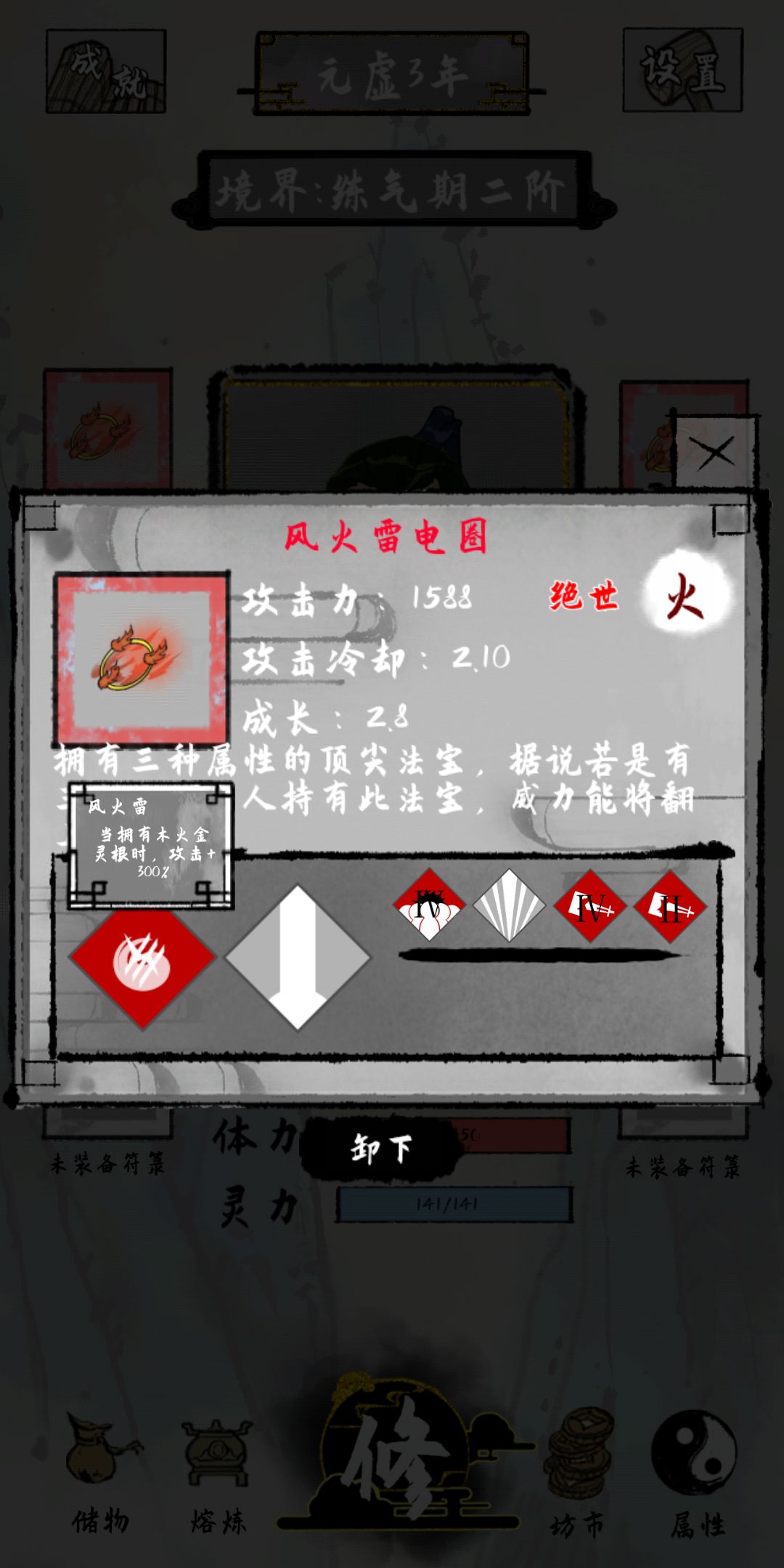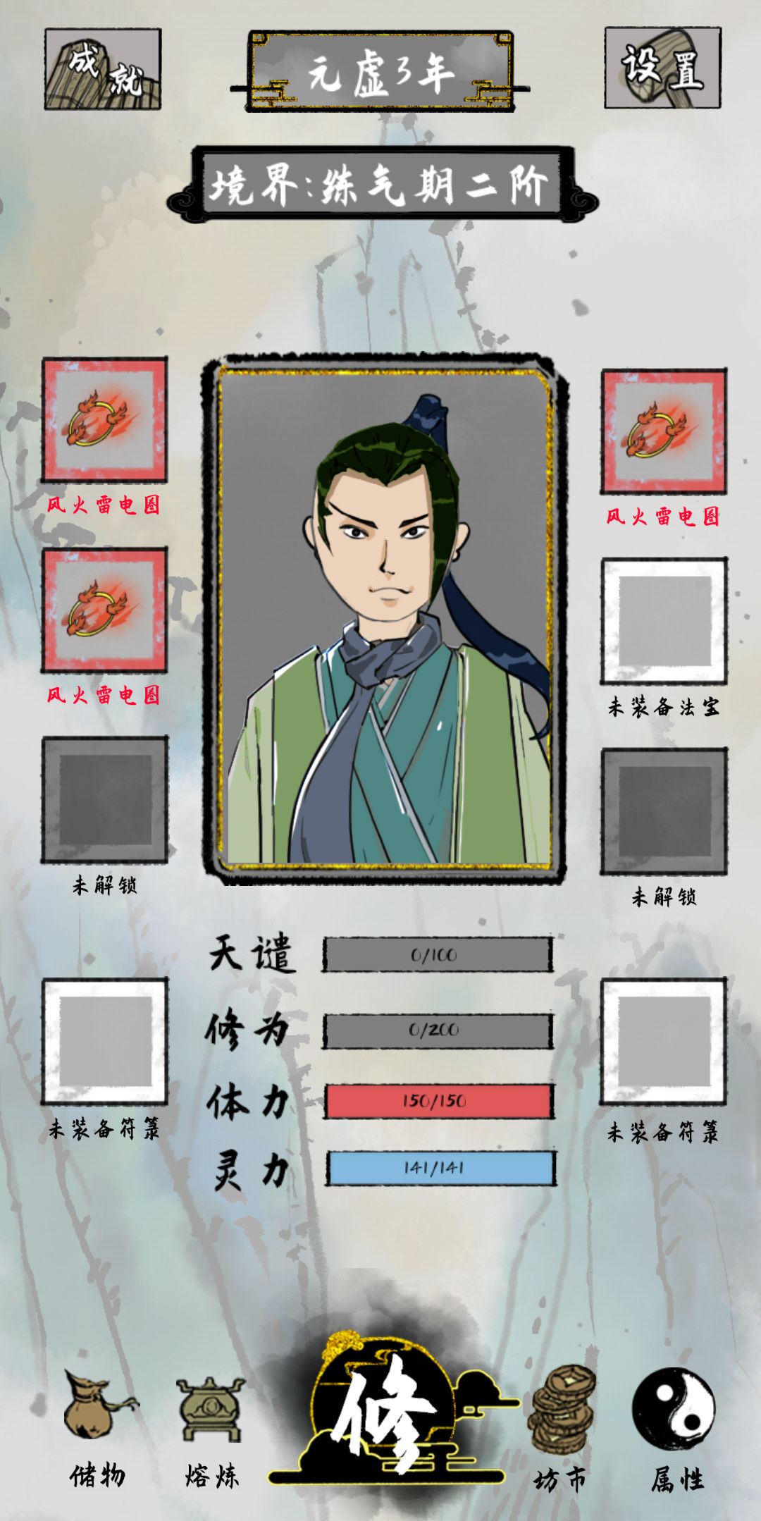 大家可以看,现在练气2阶,才过了2年,全是初始开局数据。上局天尊玩的没意思了,刚好有3个风火雷电图。