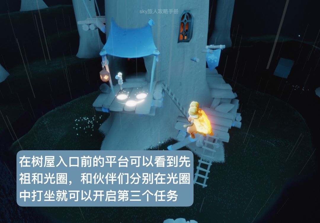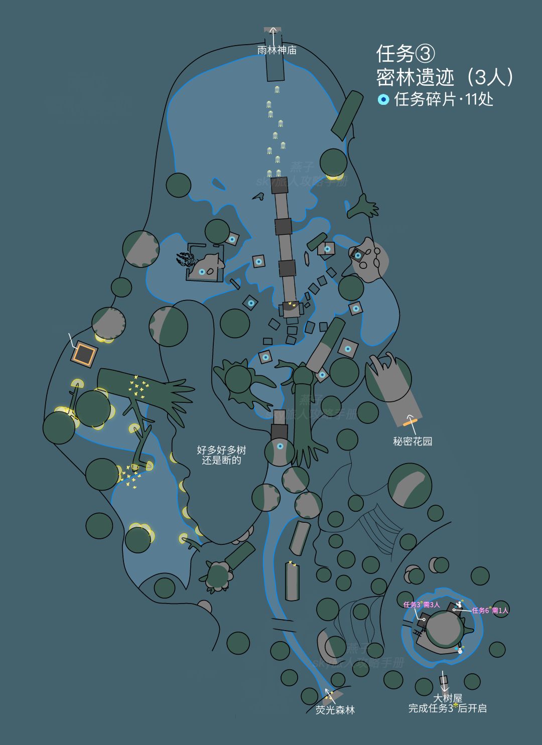 第三项任务需要三人组队完成,任务完成之后搭建了雨棚的基地不再漏雨,可以领取一颗心,和向导解锁拥抱,或许每日任务可以和向导完成了(雾)。秘密基地通往密林遗迹的密道也将会开启,快集结小伙伴一起完成任务吧。