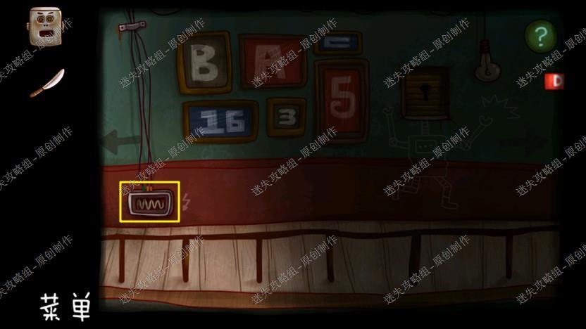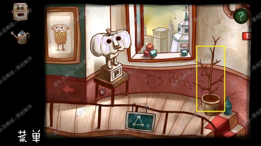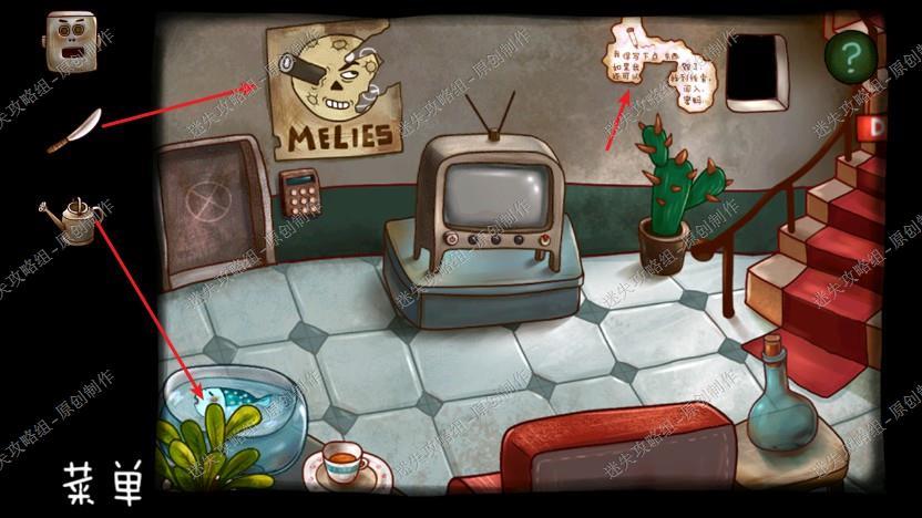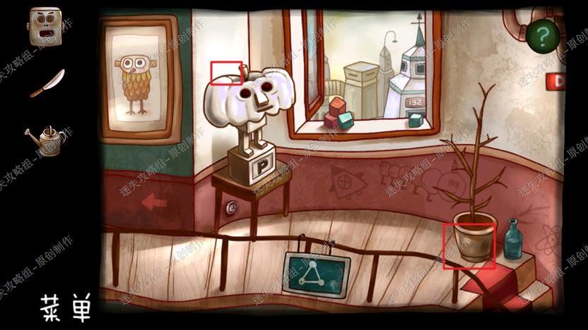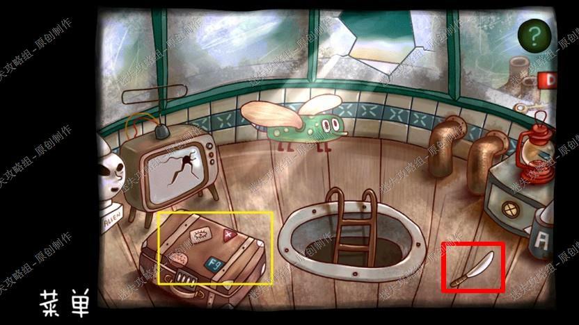 2. 我们点梯子上去,用密码打开左边的箱子,拿到机器人的头和日记碎片,在右边地板上捡起小刀,然后点击大苍蝇,它给了苹果的提示,下楼去另一个房间。