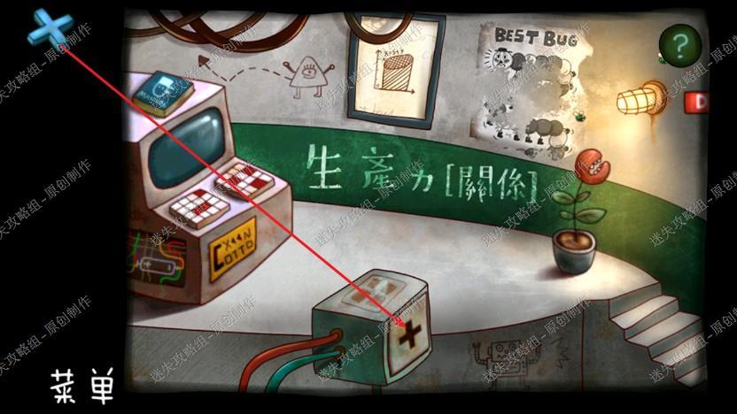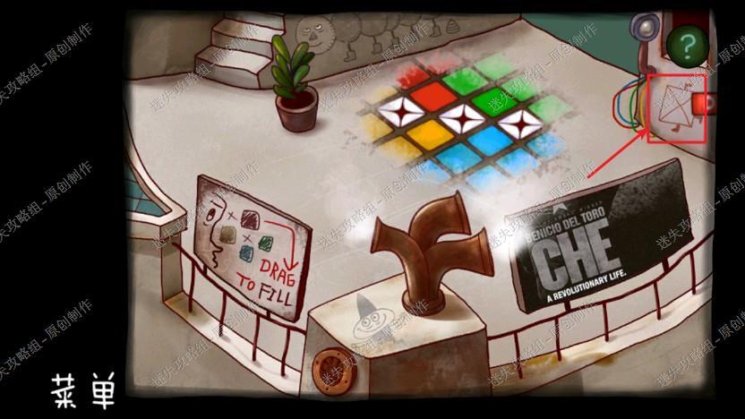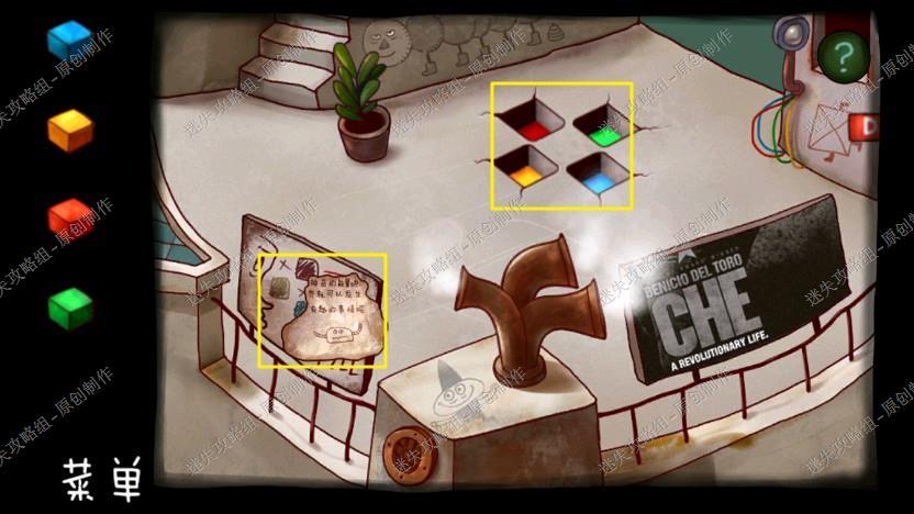 21. 回到拿到电池的工厂里,把十字架放入方块中,按下按钮,拿到绿色方块那里,点击墙上方块根据如图位置的图案破解,保存进度,进入下一章