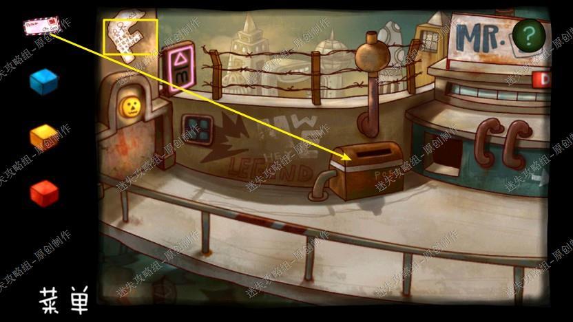 19. 在放帽子的地方有新的箭头,去到新的地点,把信放入右边的信箱,拿到绿色方块,再把墙上的日记拿走。