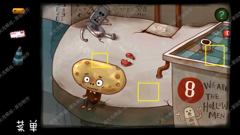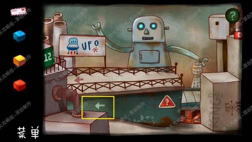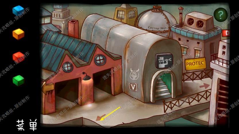 17. 回到外面,看到一号二号仓库开了,拿走蓝黄两个方块,回到广场那里拉下操作杆,下电梯,拿走地上的信,房顶的日记和土豆的帽子,上去。