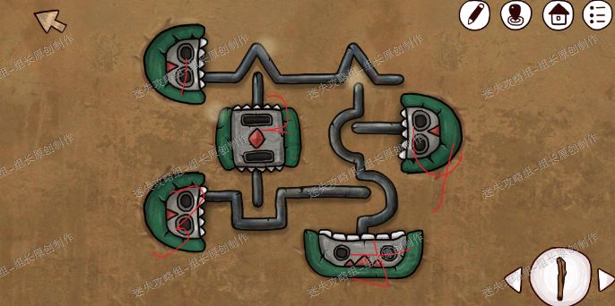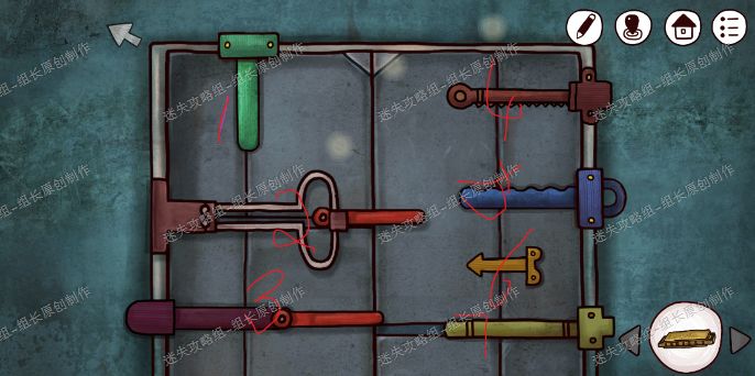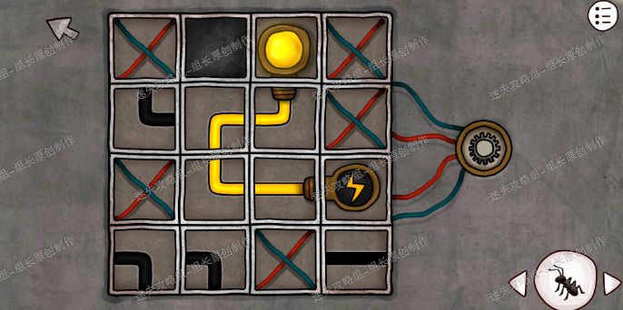 21、去放映厅 在挂画后面拿走面包,诱惑蚂蚁出来,拿走蚂蚁。22、放映厅门 通电,图示不是唯一答案(每个人都不一样哦)22
