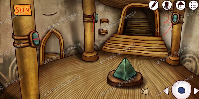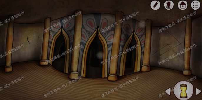8、把男人给的金币去船上 放进望远镜9、用火把烧掉藤蔓打开门 按照左左右右中中的顺序进出门 打开第四扇门 不要忘记拿走铲子 记住右边墙上的图案 已经和周目一不一样了。9