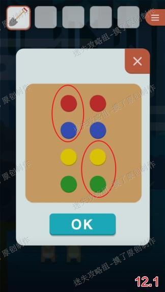 12.点击右侧箱子,解码方法为红蓝左、黄绿右(如图12.1)。提示为在貉左侧森林中的变色龙朝向(如图12.3)。