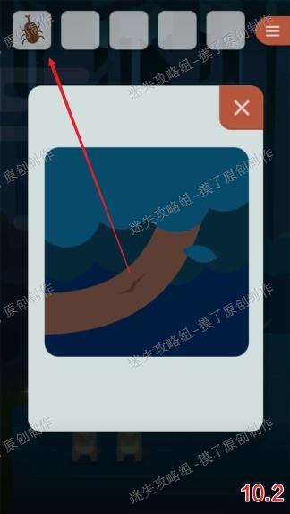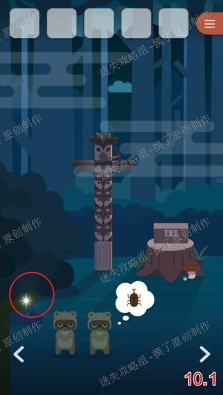 10.在森林中往左侧走,到达有图腾柱的地图,点击树上的光点获取1甲虫(如图10.1、10.2)。