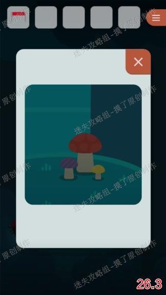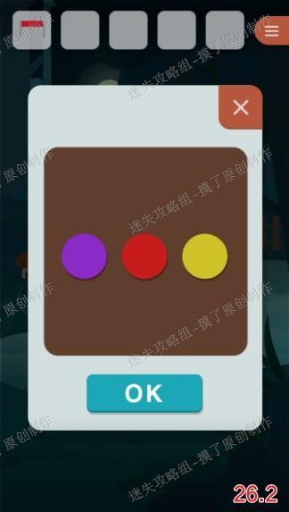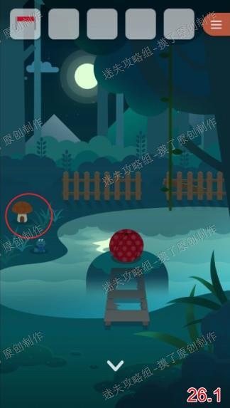 26.点击青蛙旁边的蘑菇屋,输入紫、红、黄,打开获得红色小球(如图26.1、26.2)。提示为初入森林时的蘑菇颜色(如图26.3)。