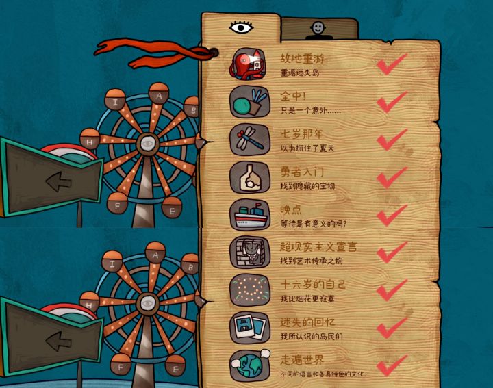 小刀割开信件,开始。小房子往右小饭店,餐厅拿餐桌上金属丝、电箱旁钥匙,后厨拿鱼缸贝壳、煤气灶上录像带、处理台瓶子。饭店巷里剧院,红半袖旁拿发条。饭店往右路过画廊进杂货店,钥匙打开绿色铁盒拿胶带。杂货店往左车站,给行李箱接上金属丝拿黄石头。餐厅电箱用胶带修好,看门外灯牌,收音机右右左左右左调频播放音乐,帮服务员把绿茶送给客人,拿餐桌香肠断断摸走小刀。车站割开墙壁海报拿票(点旁边),小房子输入111312开门,上楼拿走床上灯泡,给白半袖上发条看彩灯。剧院变换颜色红蓝黄黄白蓝开门,给蓝长袖票(点沙发右墙)(旁边箱子对照门下巷子灯牌P3'S5'O0'R2打开解锁照相机给居民拍照、别忘了小屋望远镜里那个)拿沙发旁铲子、画像上徽章,进放映室放录像带,看影片,拿绿长袖脑袋金币。小屋打开绿盒子31423拿控制杆,交给剧院门口红半袖打开海边。路过天桥,石雕身后拿石头鱼、贝壳跟红半袖换金币,往左在瞭望塔拿到红鸟,放映室好兄弟座位号14-12打开瞭望塔。画廊安红鸟开门,一楼白色画布用小屋二楼七巧板黑黄红蓝填色拿框架,二楼压杆放石头鱼拿锤(砸碎小屋一楼桌面黄瓶子解锁成就)。海边雕像用锤砸一下拿球,瞭望塔温度计放球拿沙漏(点门上方墙)。杂货店给黑半袖(点身后墙)金币换鱼饲料和鸟饲料、台灯安灯泡看钟表。车站调整时钟6:55开放站台,给站台黑西装报纸填色画廊同款右上红左下蓝右下黄拿木马、鸟饲料喂鸟拿轮。给小巷管道安轮、转出白云用瓶子装下,白云给饭店后厨蓝围裙变成苹果、鱼饲料喂鱼拿磁铁。瞭望塔(场景等一会有船)左红帐篷安徽章用画像剧院1975'画廊0028'小巷0156'天桥1997眼睛方向左下上右进游乐园。游乐园灯牌往左安木马给旋转木马通电出现四个符号、木马还可以拿走,往左转好颜色打开烟花机、屏幕倒计时结束出现三角块按笑脸点燃烟花拿神秘三角石(20秒时按一下)。灯牌往右路过塔看到一片连起来的点、全部点亮变成船拿沙漏状的块。用小屋一楼摩天轮墙画○×●○×○●○打开塔大门(点右墙),墙壁用黄石头蓝石头磁铁填满、三角石安在柱体出现门、旋转木马符号43612开门上去,安好沙漏状块、天桥画板图案苹果木马框架沙漏放好物品。故地重游,新游戏。