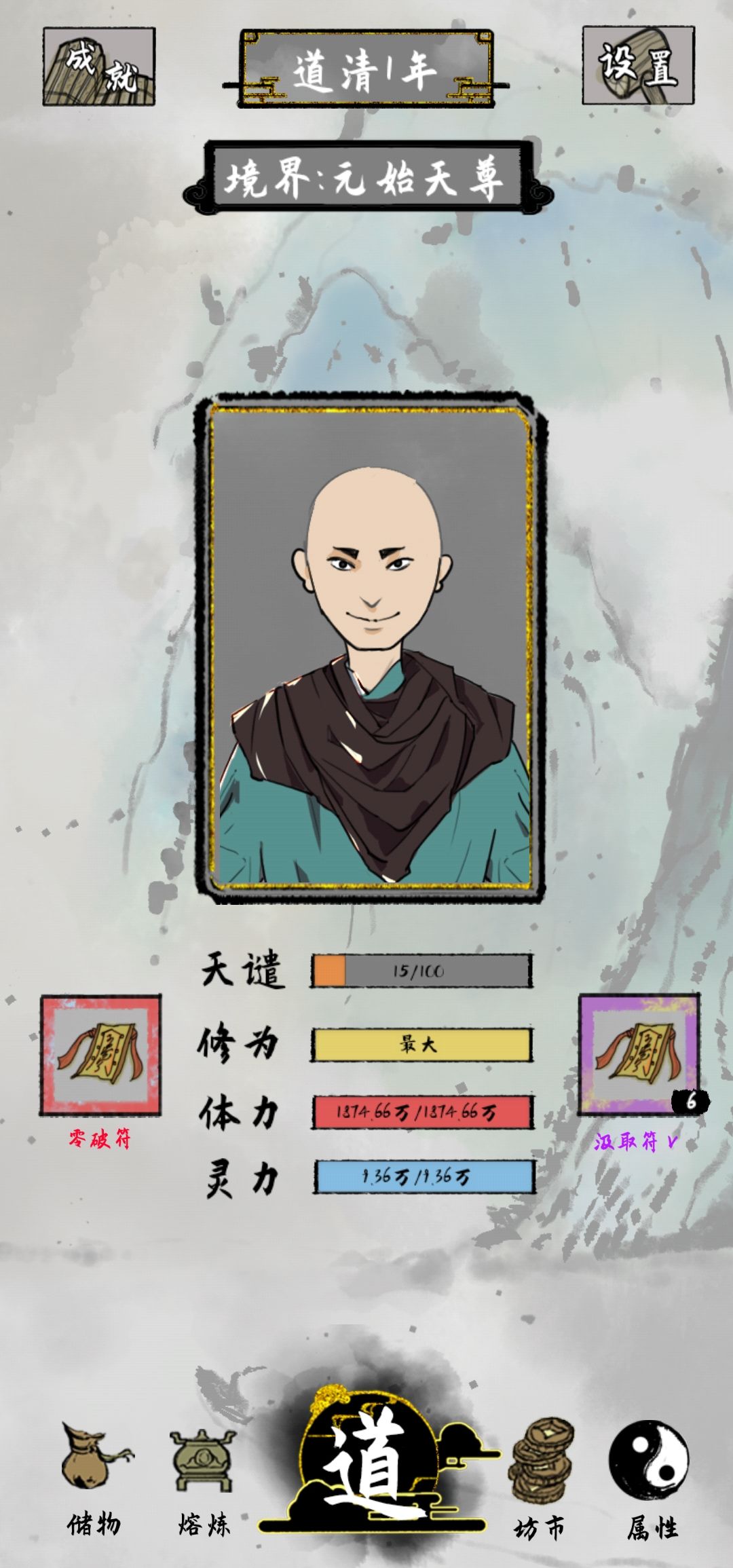第二次天尊了,感觉游戏没有难度了开局有霸王神拳,和福禄大师,再随便来个加修炼速度的,或者木头人随便过😂。