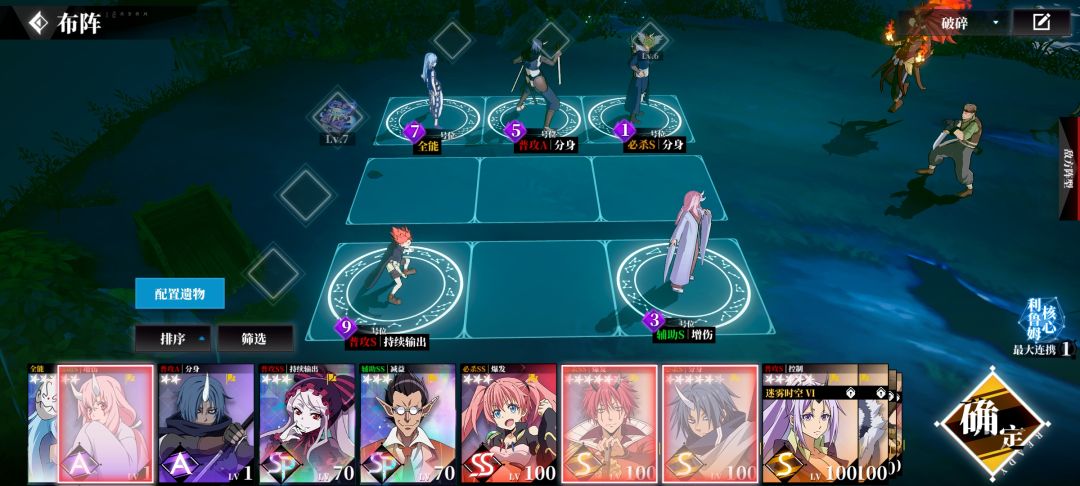 可以看到这个阵容和上面没什么区别,只是站位和遗物有些变化,这种布阵是为了手动应对关卡的,因为可能伤害不够一波秒,所以可以后手,让对面先打一套,利用储魂吊坠和慈悲圣典最大化S苍的爆发伤害(储魂吊坠和A紫苑被动一样,防止前排暴毙的同时可以满足慈悲圣典生命小于50%增加队友百分比攻击力的buff效果)
