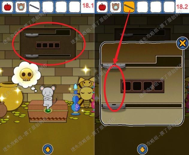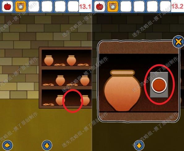 13.点击放瓦罐的柜子,右下角空缺处,再点击出现的开关(如图13.1、13.2)。此处点击空隙后不要返回,直接按按钮,如果瓦罐移动后返回会导致无法继续游戏。