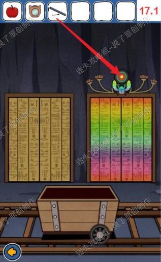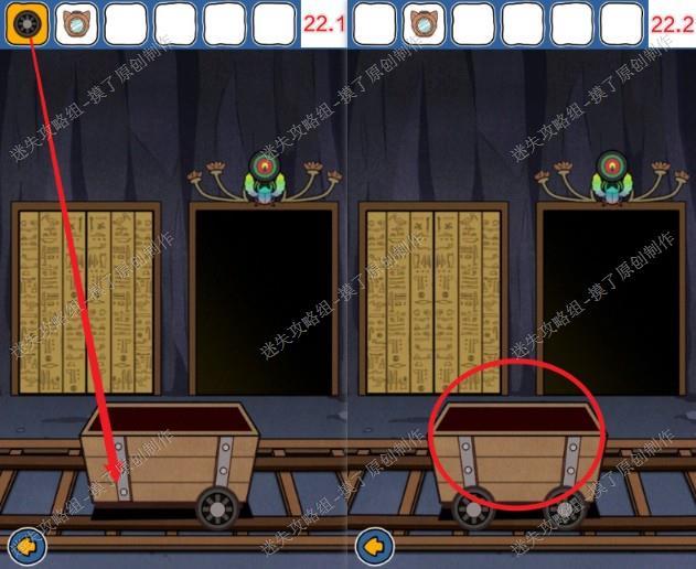 22.返回有矿车的房间,把轮子给矿车装上,点击矿车,游戏通关(如图22.1、22.2)。