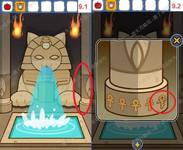 11.返回右侧房间,点击左侧柱子,多次点击打开柱子放入阀门,把水关了(如图11.1、11.2)。