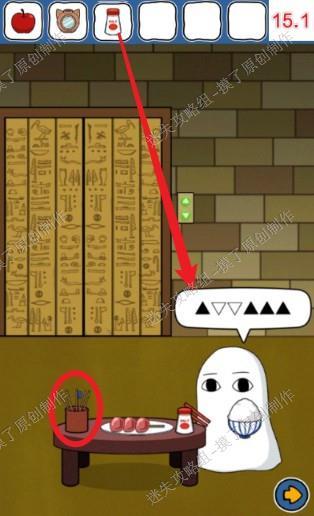 15.把盐给旁边在吃饭的白色生物,获得背后的门解码方法↑↓↓↑↑↑,开启它身后的门,并点击桌子,获得筷子筒里的箭(如图15.1)。