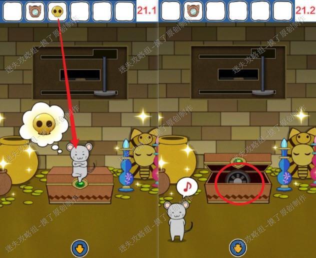21.把金骷髅给宝库里的老鼠,打开宝箱获得轮子(如图21.1、21.2)。