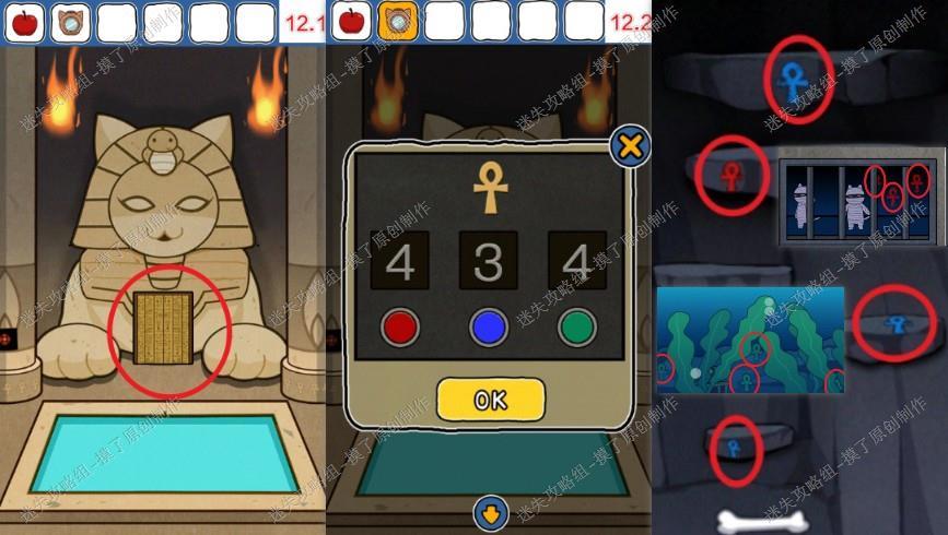 12.点击法老像中间,输入红4蓝3绿4,开启下一层(如图12.1、12.2)。解码方法为之前地图上所有符号的颜色和数量。