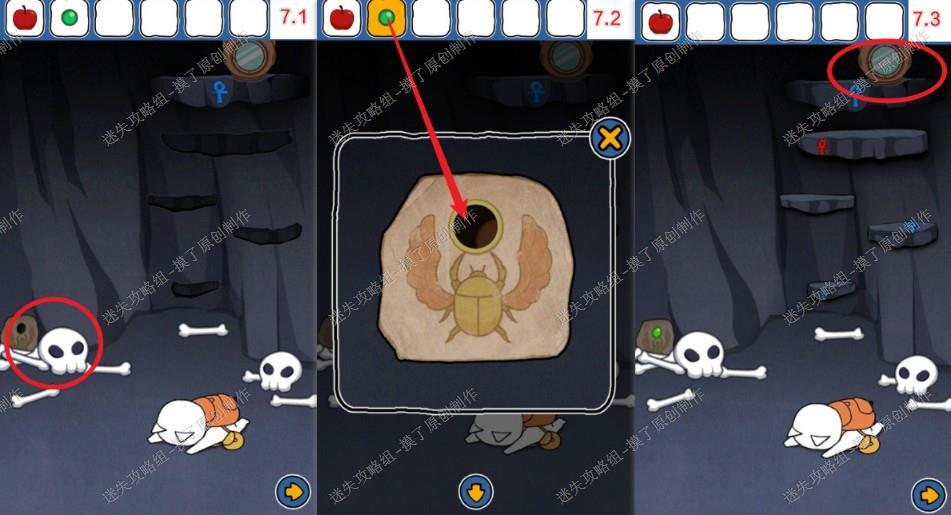 7.返回最左边的洞窟,点击左下角骷髅,把绿色宝石装上去,获得最顶上的潜水头盔(如图7.1、7.2、7.3)。