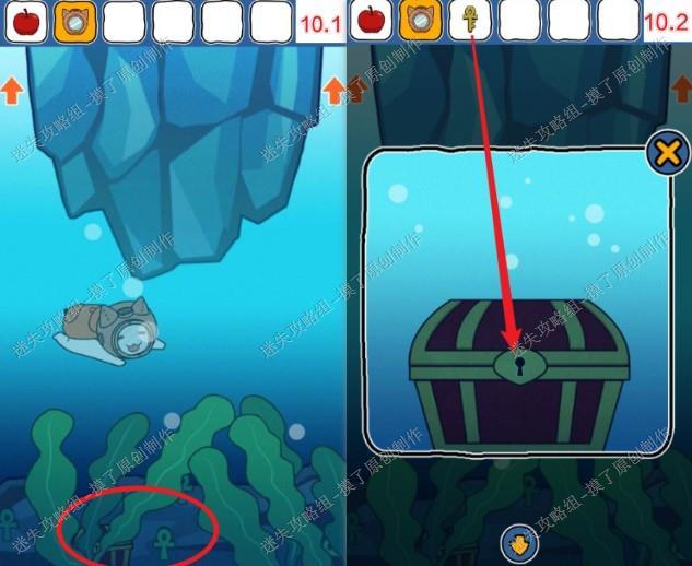 10.使用潜水头盔返回水中,点击中间的宝箱,用钥匙打开,获得阀门(如图10.1、10.2)。
