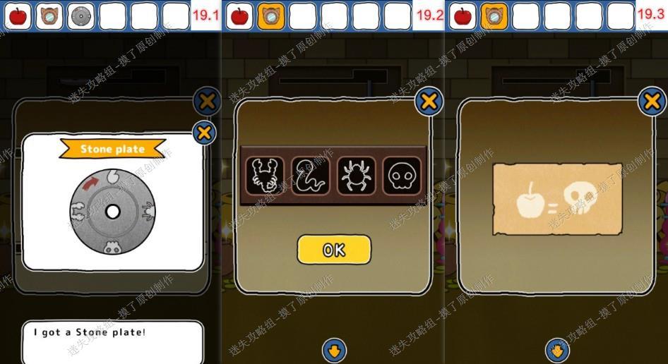 20.返回有矿车的房间前往左侧房间,把圆盘装在展示柜底下,用苹果换金骷髅(如图20、1、20.2)。
