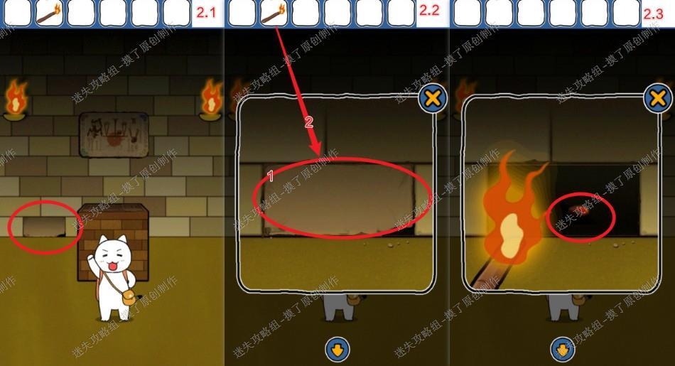2.点击左下角不一样的砖块,多点几次出现一个洞,用火把照明,获得橙色宝石(如图2.1、2.2、2.3)。