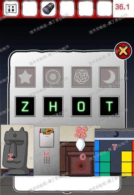 36.按照密码上侧提示找到对应的图案及对应的字母,输入ZHOT解锁出口(如图36.1)。