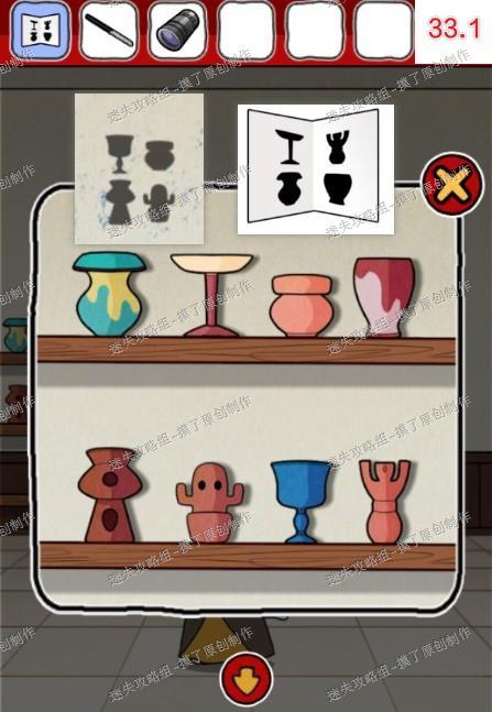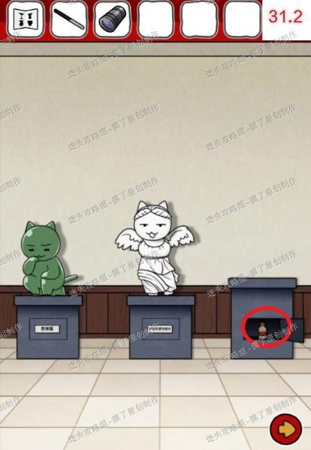 33.前往带珍珠耳环的少女喵处,对照之前的纸片和墙上的图示摆好物品,解锁宝箱获得糖(如图33.1、33.2)。