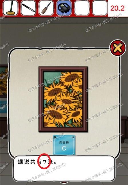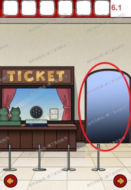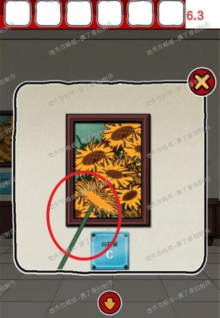 6.点击售票处右侧门前往下一层房间,点击最左侧向日葵画获得拖把(如图6.1、6.2、6.3)。