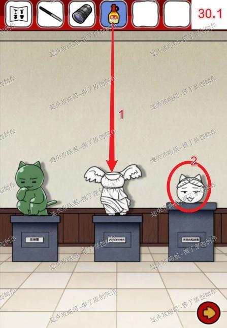 30.前往最里层房间,最左侧很多雕塑处,在石膏身体的脖子上涂上石膏粘合剂,再返回点击头,拼装两个雕像(如图30.1、30.2)。