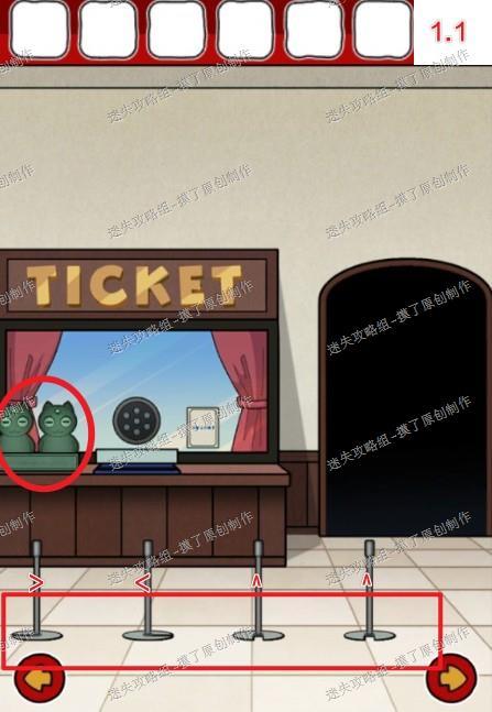 1.点击售票处前招财猫,按照地面栏杆的朝向点出眼睛朝向><^^,获得硬币(如图1.1、1.2)。