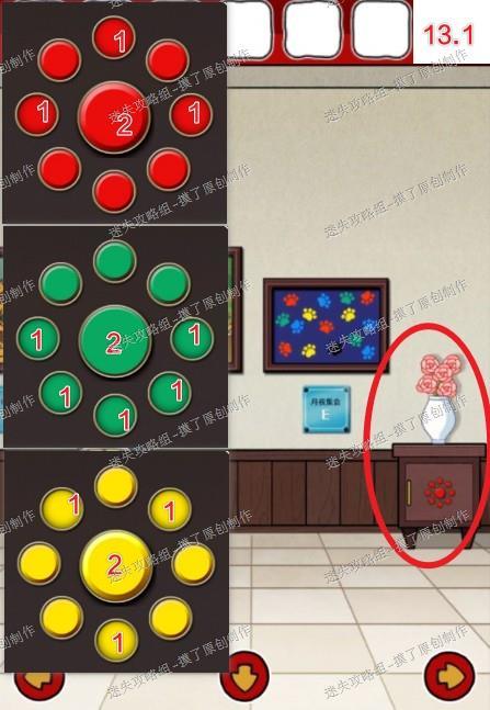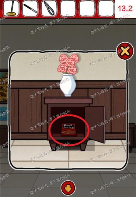 13.返回获得拖把的房间,点击右侧放花的柜子,如图所示输入3次密码,打开获得牛肉干(如图13.1、13.2)。