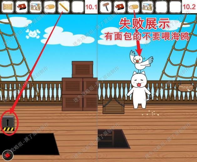 10.前往二楼最左侧房间,用钥匙打开通往甲板的锁,前往甲板右侧,用金棍子插入左下角装置,打开后大炮被运上甲板(如图10.1)。此时也不需要点燃大炮,同时甲板上会有个海鸥,旁边有个木板说不要喂它,有面包的玩家不要喂,没有的直接忽略即可,喂了会导致游戏失败。