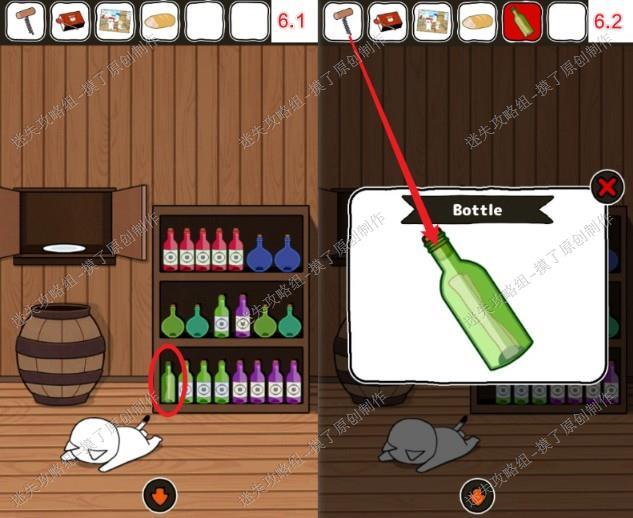 6.返回一楼的房间,点击酒架左下角的瓶子用开瓶器打开,获得藏宝图(如图6.1、6.2)。