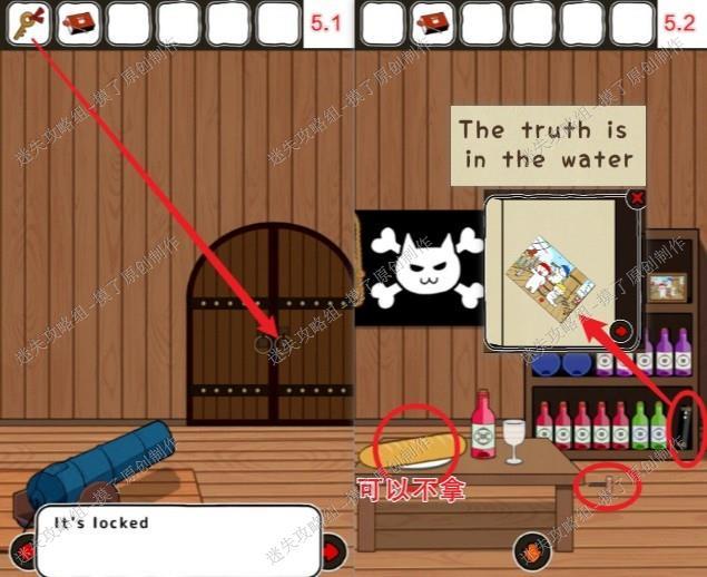 5.向左走,用钥匙打开大炮前的门,在房间中获取1开瓶器、1日记中的照片(如图5.1、5.2),并获得提示“真相在水之下”面包可以不拿,不会对后续游戏有影响,拿了反而可能会逃脱失败。