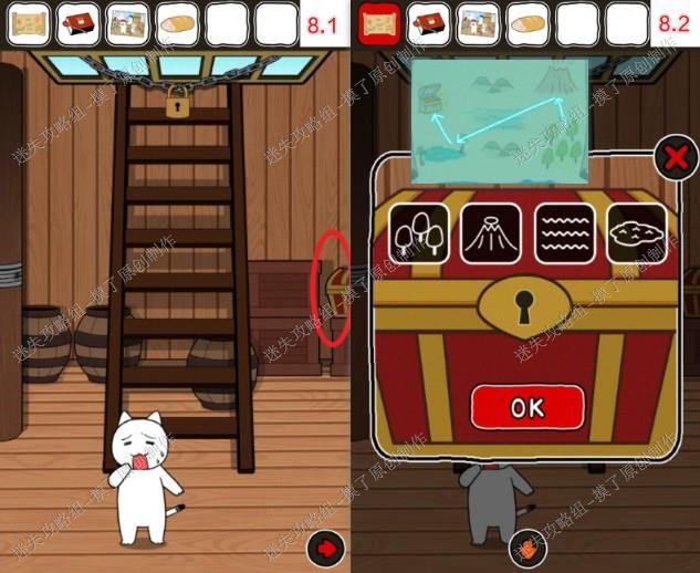 8.前往2楼最里侧房间,点击右边宝箱,按照藏宝图箭头输入,获取金色棍子(如图8.1、8.2)。
