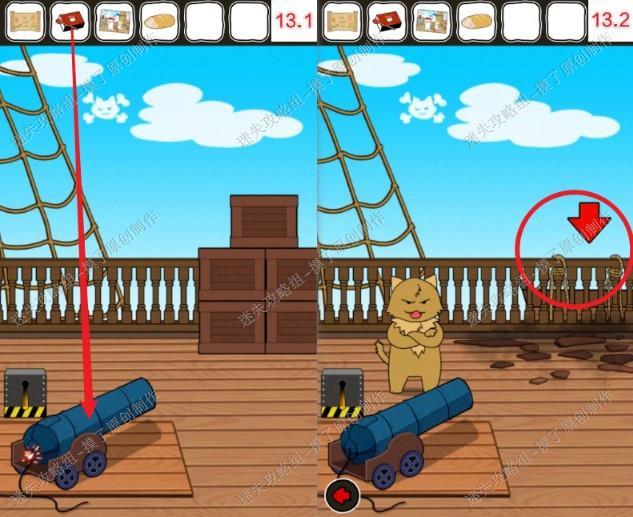 13.前往甲板用火柴点燃大炮,点击栏杆旁的箭头,游戏通关(13.1、13.2)。