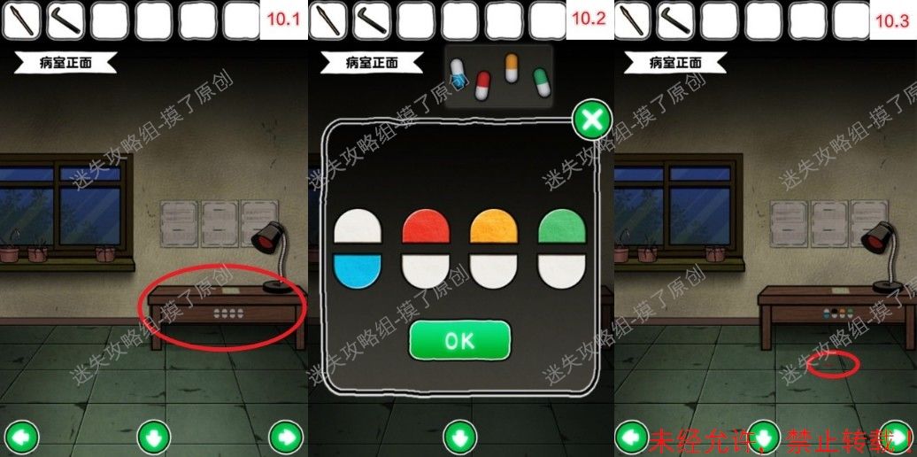 10.返回病室正面,把右侧抽屉的按钮颜色变为“蓝下、红上、黄上、绿上”,获得红色按钮(如图10.1、10.2、10.3),解码提示为刚才药丸的颜色。