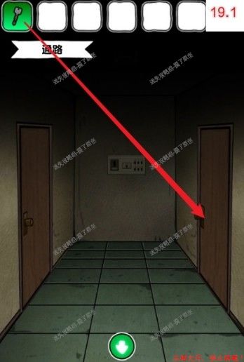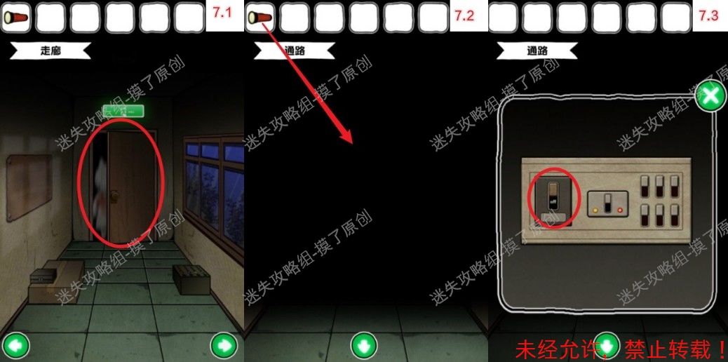 7.向右到达走廊,点击中间的门,对漆黑的通路使用手电筒,开启电源(如图7.1、7.2、7.3)。