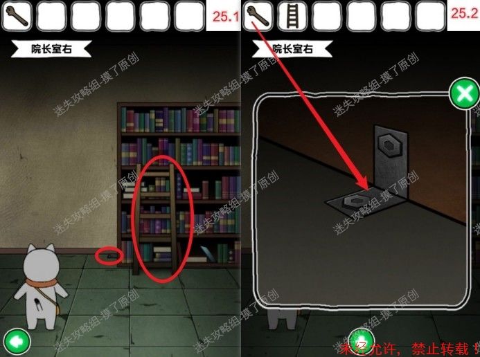 25.前往院长室右侧,点击获取梯子,点击书架左下角用扳手拧开,拆掉用金属固定的部分(如图25.1、25.2)。
