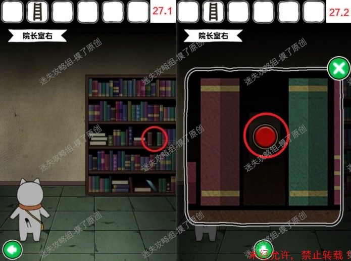 27.点击书架最中间一排红绿两本书中间的空隙,打开密室(如图27.1、27.2)。